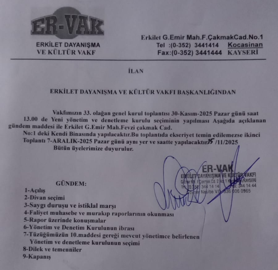 Vakıfımızın 33. olağan genel kurul toplantısı 30-Kasım-2025 Pazar günü saat 13.00’te yeni yönetim ve denetleme kurulu seçiminin yapılması için aşağıda açıklanan gündem maddesi ile Erkilet G. Emir Mah. Fevzi Çakmak Cad. No:1’deki kendi binasında yapılacaktır.
